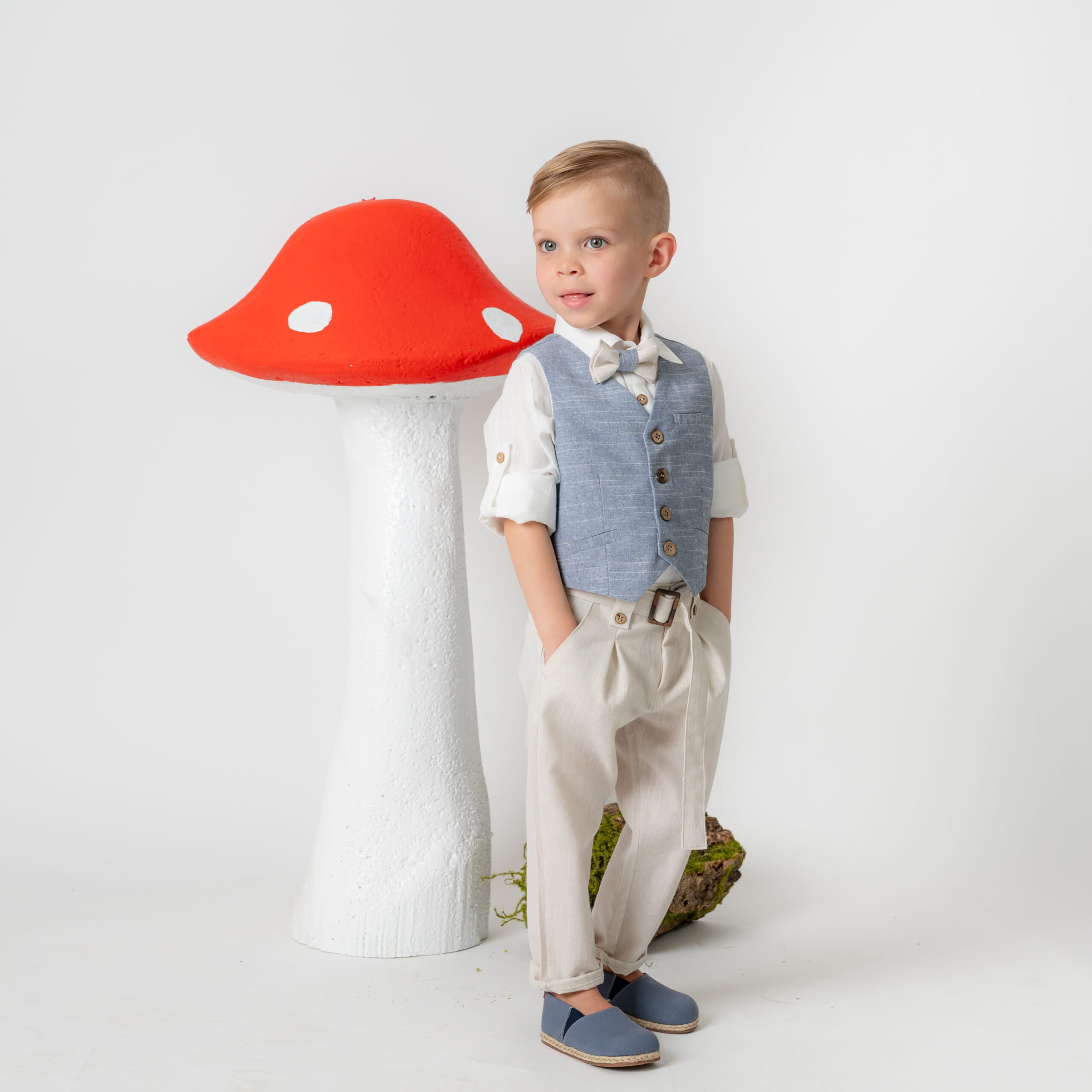 Παντελόνι από λινό και βαμβάκι ,εκρού, με κουφόπιετες και ζώνη από το ύφασμα του παντελονιού . Με λάστιχο στην μέση για ρύθμιση του μεγέθους. Πουκάμισο εκρού λινό/βισκόζ και γιλέκο από λινό βαμβάκι σε μπλε ραφ. Συνοδεύεται από ψάθινο καπέλο σε χρώμα εκρού ή μπλε .